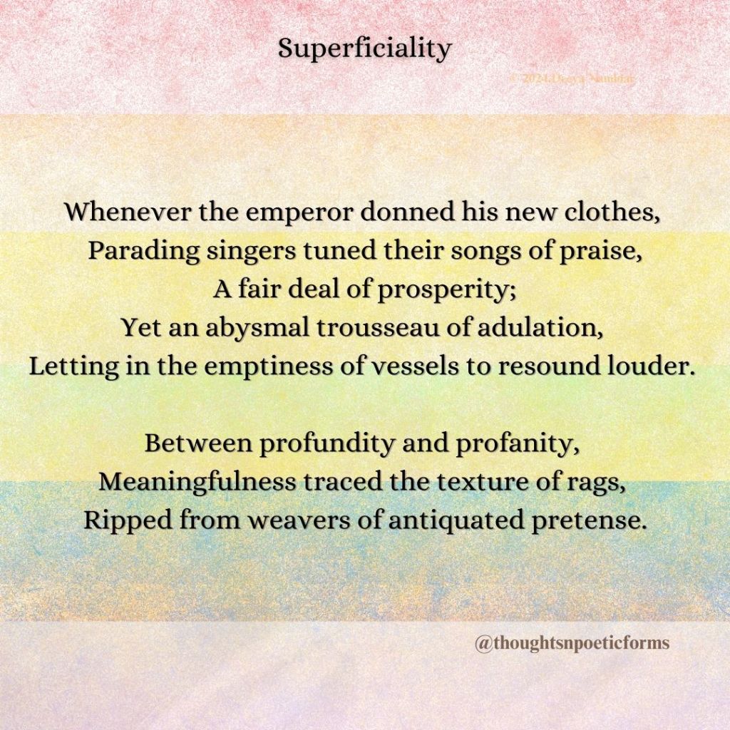 I have written a ‘Monostich’, a contemporary poetic form of single-line verse, known for its expressive brevity. In this compact space, complex ideas and imagery converge, inviting contemplation and interpretation.